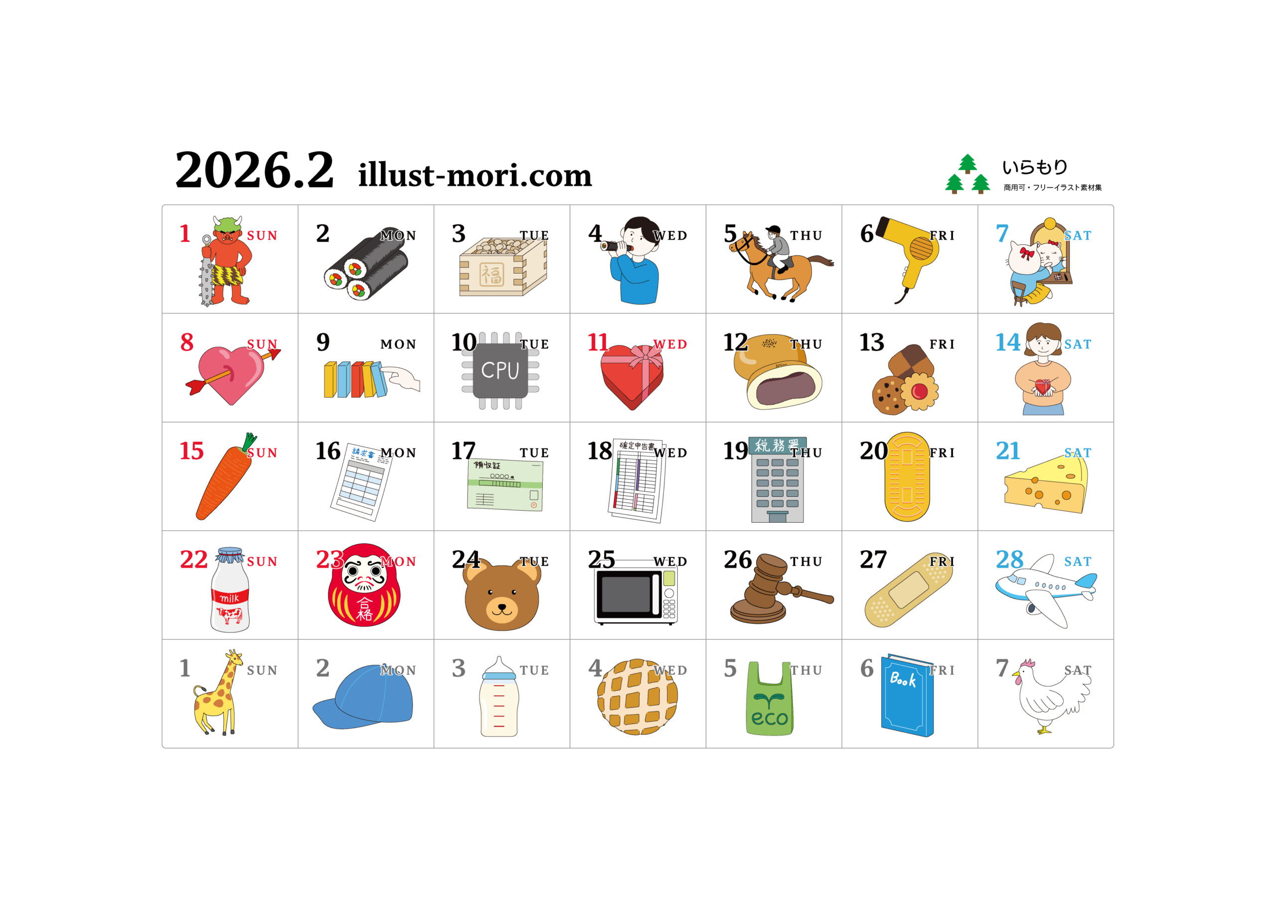 2026年2月のカレンダーをモチーフに、節分やバレンタイン、確定申告、受験などの季節行事や、日常雑貨、動物、食べ物などのアイコンを豊富に詰め合わせたイラスト素材セットです。手描き風の温かみのあるタッチで、広告、Webサイトのバナー、SNS投稿、チラシ、プレゼン資料、ブログ記事の挿絵など幅広い用途に最適です。白背景のカットアウト形式で使いやすく、スケジュール管理や季節の案内、生活情報の図解に便利です。