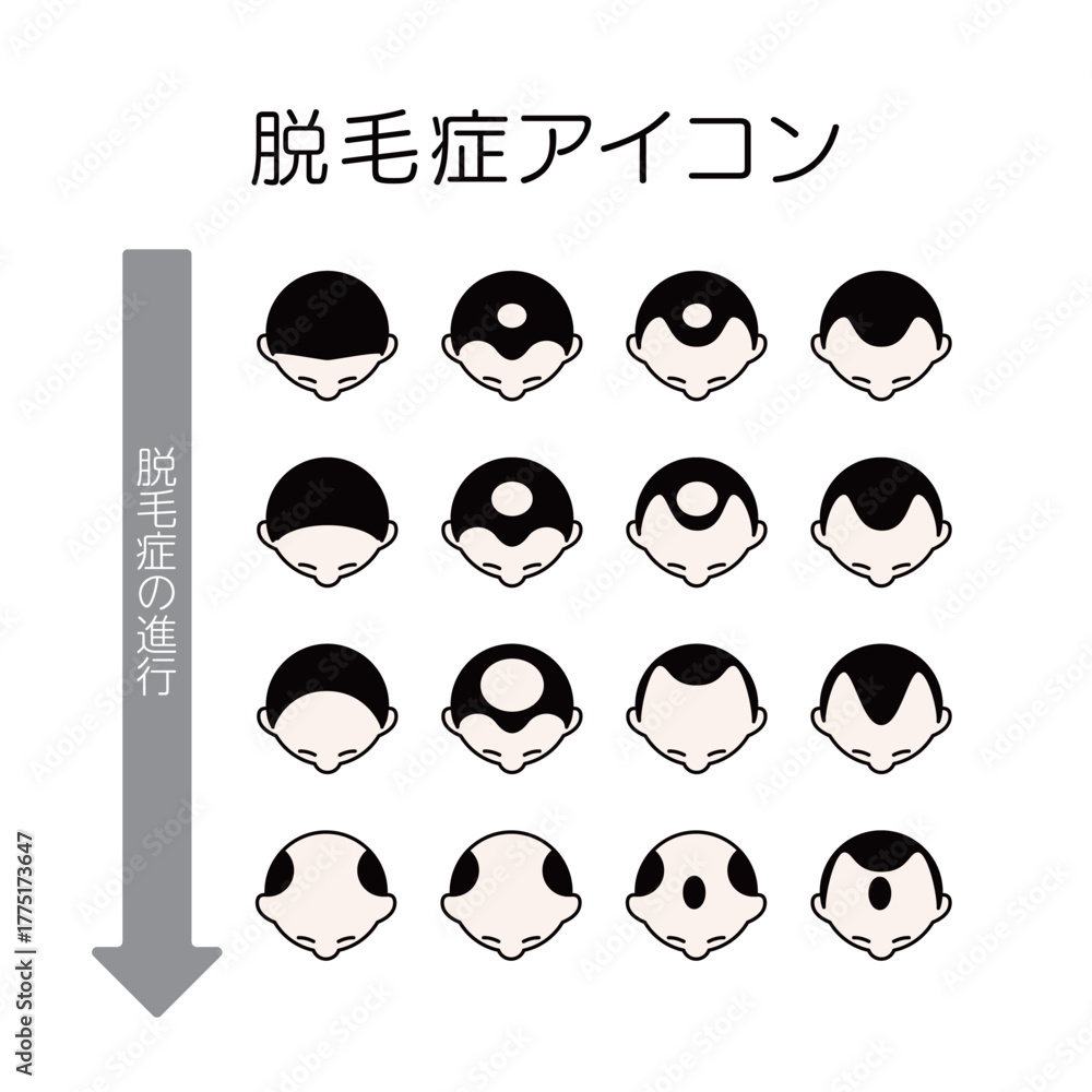 アイコンのイラスト 脱毛症のイラスト脱毛症(だつもうしょう/Alopecia)の進行をわかりやすく示したアイコンセットです。頭頂部の薄毛やM字ハゲなど、男性型脱毛症(AGA)を段階的に表現しており、医療や美容、ヘアケア関連の資料や説明図として活用できます。シンプルで見やすいデザインのため、Webサイトやプレゼン資料、パンフレットなどにも使いやすい素材です。