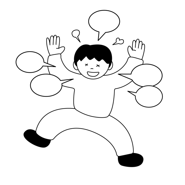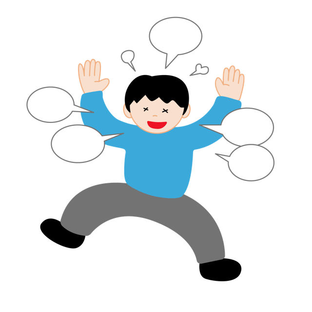 多弁で活動的な様子を見せる男性のイラスト素材セットです。フラットな画風で、多くの吹き出しと共に活発に動く姿を描いています。双極性障害の躁状態や、精神的な高揚、多弁な症状を説明する図解として最適です。医療系のWebサイト、メンタルヘルス関連のブログ、心理学のプレゼン資料、疾患啓発のパンフレット、SNSのバナーなど、精神医学に関する幅広い媒体でご活用いただけます。