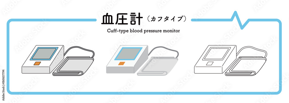 フラットデザインで描かれた上腕式血圧計のカフのイラストセット。カラー・淡色・線画の3パターン | 医療広告や健康管理のウェブサイト用素材 Stock ベクターをダウンロードし、Adobe Stock で類似のベクターを探しましょう。