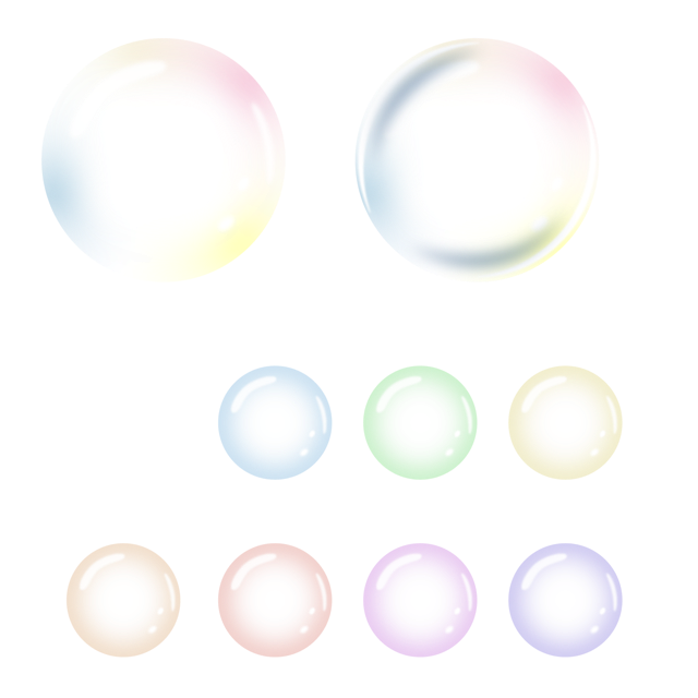 シャボン玉(バブル/ソープバブル/Soap bubble)は、光を反射して虹色に輝く透明な泡のイラストです。カラフルで幻想的な雰囲気を演出でき、清潔感・爽やかさ・夏らしさを表現したいデザインにも最適です。透明感のあるバブル(泡素材)は、背景やフレーム、ポスターなど多用途に使える汎用的なデザイン素材です。