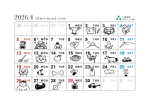 2026年4月のアナログ感溢れる手書きカレンダー素材です。各日付の枠内に、毎日異なるユニークでゆるいタッチのアイコンが配置されており、視覚的に楽しくスケジュールを確認できます。新生活や春のイベントをイメージさせるモチーフから、動物、食べ物、日用品まで幅広い挿絵が揃っています。Webサイトの季節コンテンツや、個人の手帳、プリントアウトして掲示するメモなど、親しみやすさを演出したい媒体に最適です。