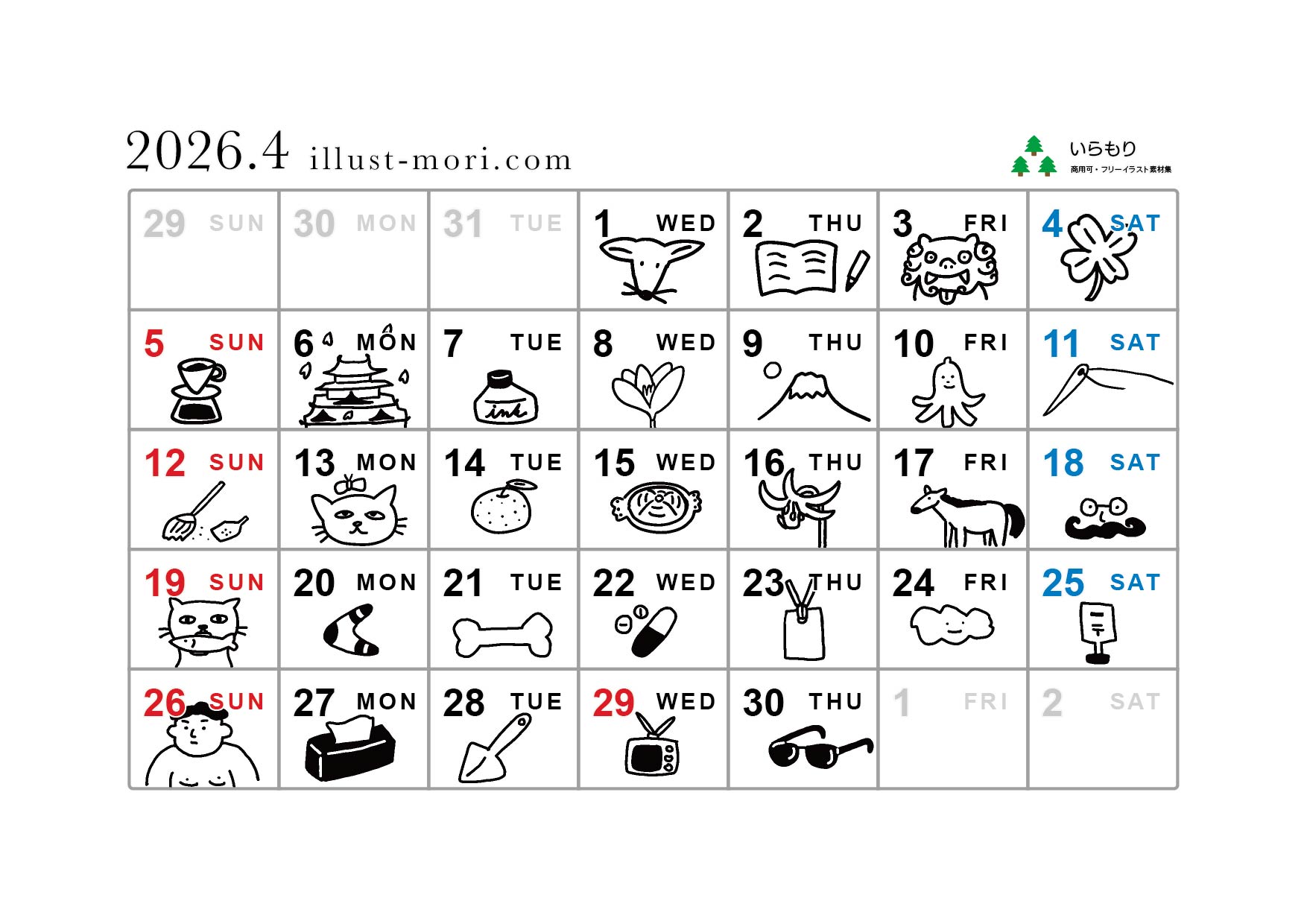 2026年4月のアナログ感溢れる手書きカレンダー素材です。各日付の枠内に、毎日異なるユニークでゆるいタッチのアイコンが配置されており、視覚的に楽しくスケジュールを確認できます。新生活や春のイベントをイメージさせるモチーフから、動物、食べ物、日用品まで幅広い挿絵が揃っています。Webサイトの季節コンテンツや、個人の手帳、プリントアウトして掲示するメモなど、親しみやすさを演出したい媒体に最適です。