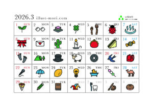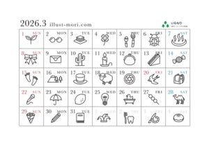 2026年3月の月間カレンダー素材です。各日付の枠内に、ひな祭りやホワイトデーなどの行事、春をイメージさせる植物、動物、食べ物、文房具などの可愛らしいアイコンを配置しています。広告やWebサイトのスケジュール案内、社内報、教育機関の掲示物など、幅広い用途でご活用いただけます。白背景に映えるカラフルでシンプルなデザインは、視認性が高く、春の明るい雰囲気を演出するデザインパーツとして最適です。