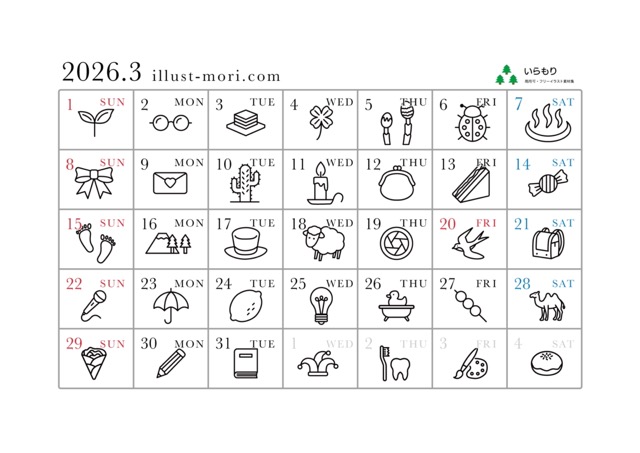 2026年3月の月間カレンダー素材です。各日付の枠内に、ひな祭りやホワイトデーなどの行事、春をイメージさせる植物、動物、食べ物、文房具などの可愛らしいアイコンを配置しています。広告やWebサイトのスケジュール案内、社内報、教育機関の掲示物など、幅広い用途でご活用いただけます。白背景に映えるカラフルでシンプルなデザインは、視認性が高く、春の明るい雰囲気を演出するデザインパーツとして最適です。