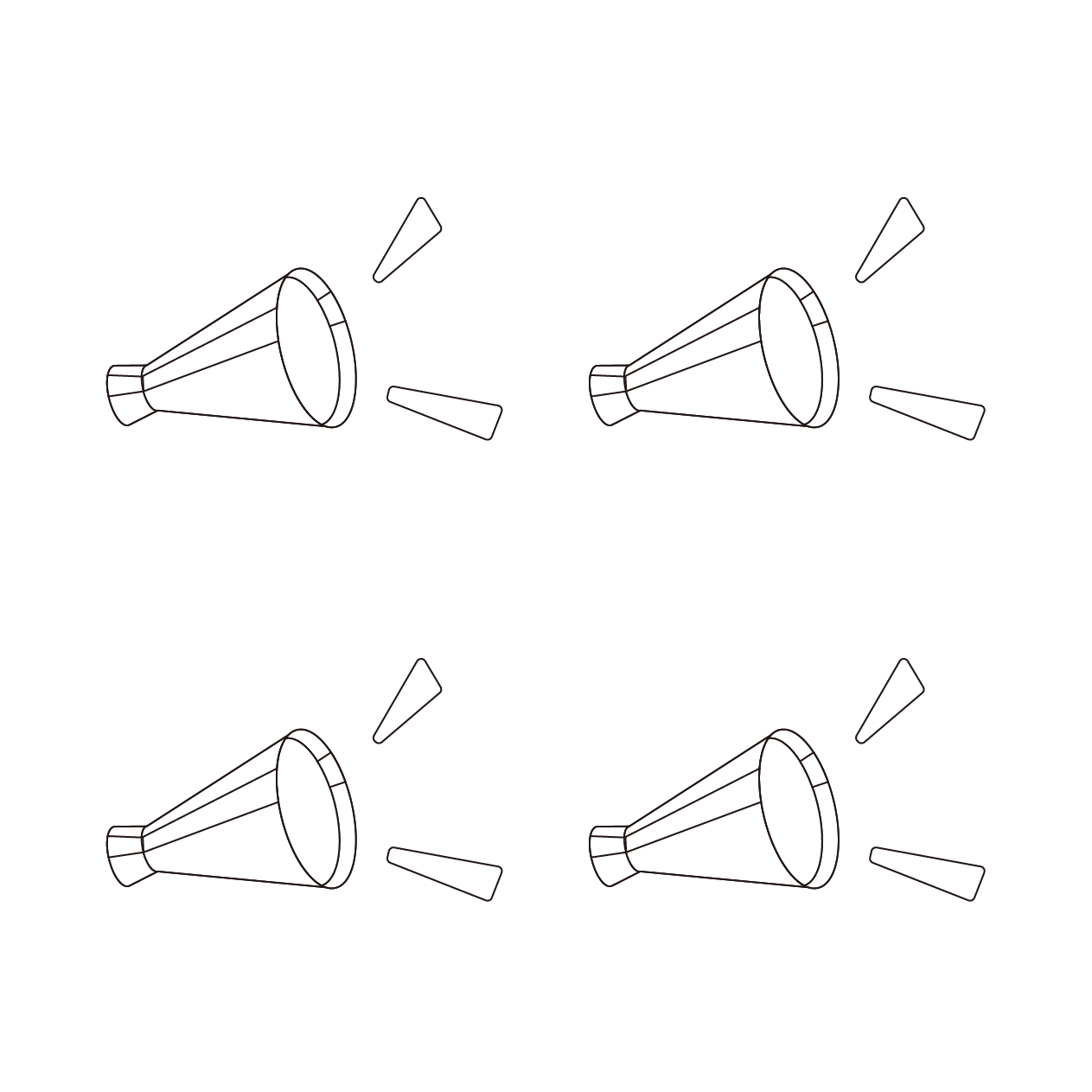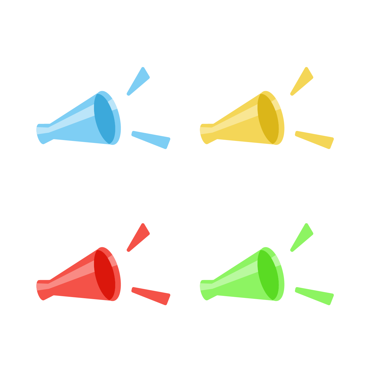 メガホン(メガフォン/Megaphone/応援スピーカー)は、スポーツやイベント、学園祭などで声援を送る際に使われる応援グッズです。カラフルなメガホンのイラストは、チアリーディングや運動会、チーム応援のデザイン素材として人気があります。青・赤・黄・緑などの色分けで、チームカラーを表現したり、元気で明るい雰囲気を演出するのに最適です。