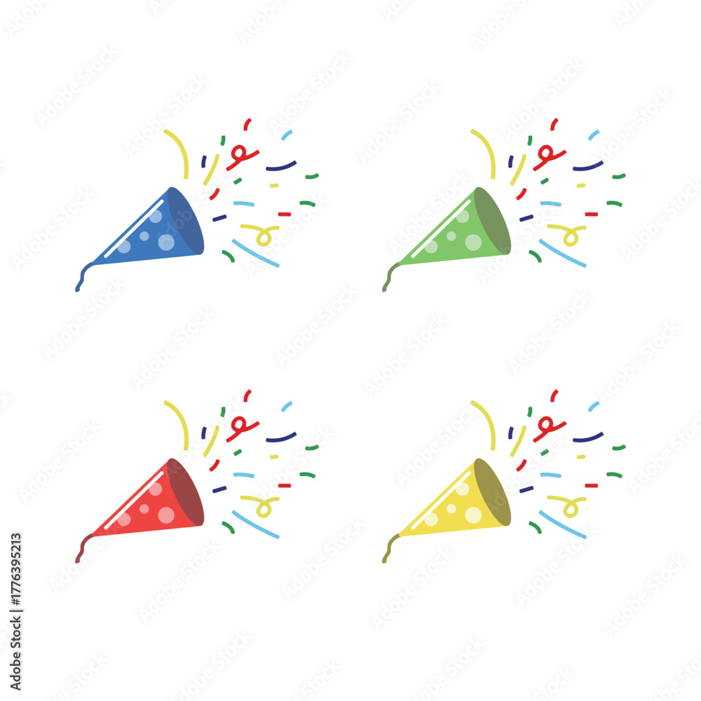 カラフルなクラッカーのイラストセット(青・緑・赤・黄のパーティーアイコン) Stock ベクターをダウンロードし、Adobe Stock で類似のベクターを探しましょう。