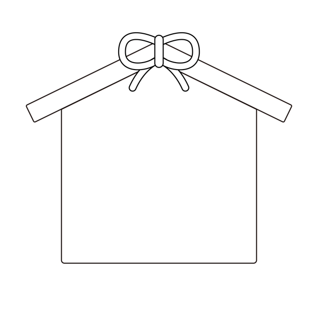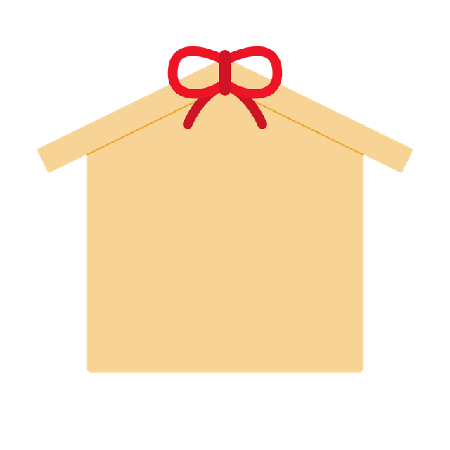 赤色の紐がリボン結びされた、シンプルなデザインの無地の絵馬のイラスト素材です。和風の温かみを感じさせる色合いで、五角形のフォルムを太めの線で描いています。文字が書かれていないため、自由なメッセージや目標を書き込んでお使いいただけます。正月の広告、初詣の案内、合格祈願のバナー、SNSの投稿画像、神社のイベントチラシ、Webサイトの装飾、プレゼン資料のアクセントなど、幅広い用途に最適です。