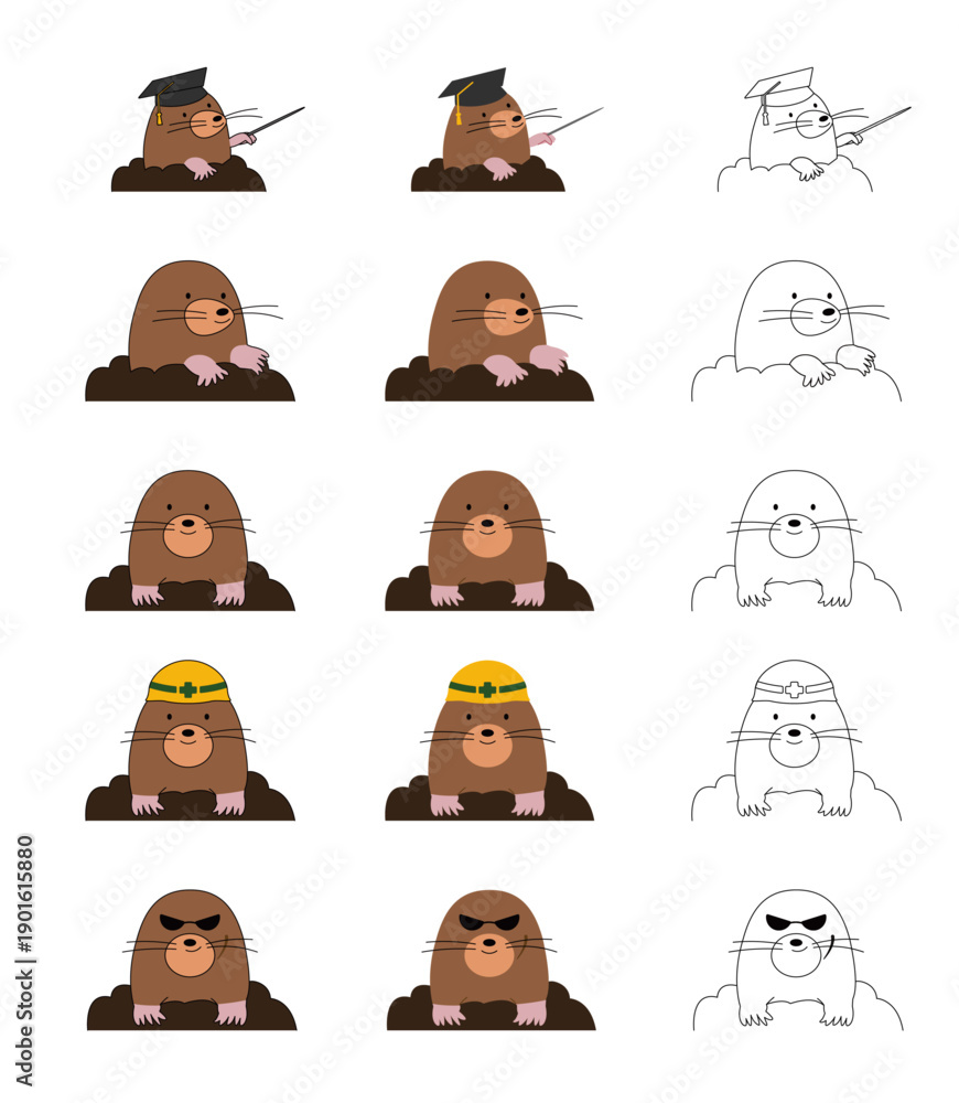 地中から顔を出す土竜の様々なポーズや衣装のイラストレーション詰め合わせ | 建設・学習・対策などの多様な用途 Stock ベクターをダウンロードし、Adobe Stock で類似のベクターを探しましょう。