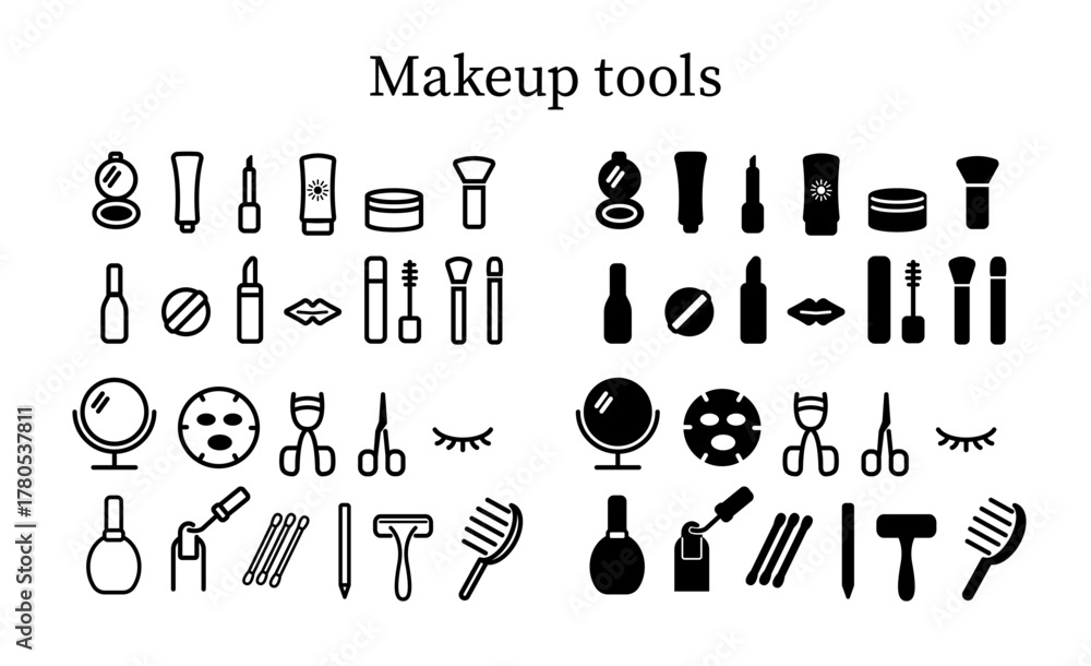 メイク道具のアイコンセット|化粧品・ビューティーツールのシルエットイラスト Stock ベクターをダウンロードし、Adobe Stock で類似のベクターを探しましょう。