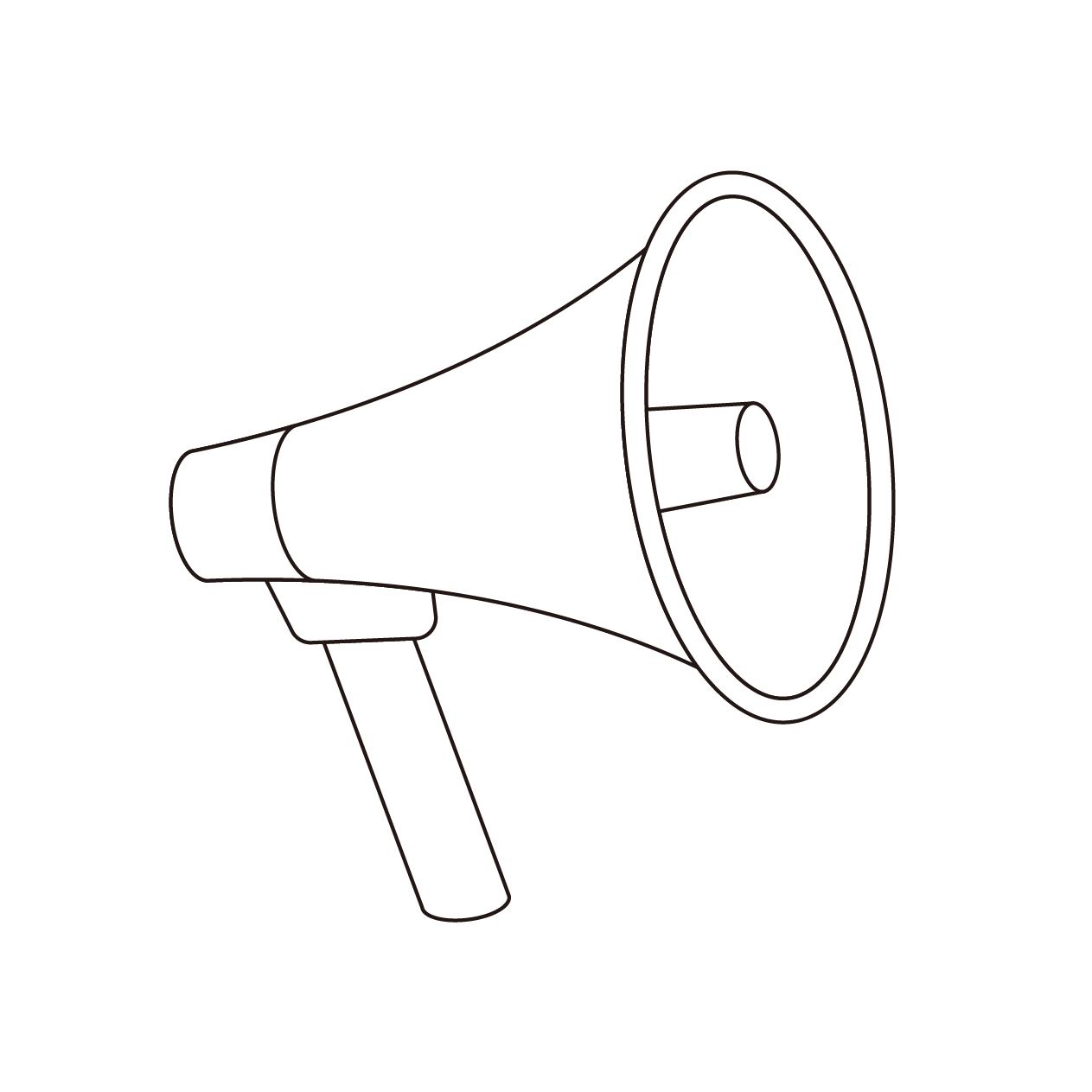 メガホン(メガフォン/拡声器/Megaphone)は、声や音を遠くまで届けるための器具です。イベント会場や学校行事、デモ、スポーツ応援などで使われることが多く、アナウンスやお知らせ、注意喚起(アテンションコール)にも活用されます。告知や宣伝、広報素材としても人気のあるメガホン(拡声器)のイラストは、チラシやポスター、Webデザインなど幅広い場面で利用できます。
