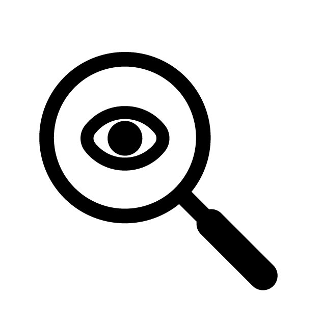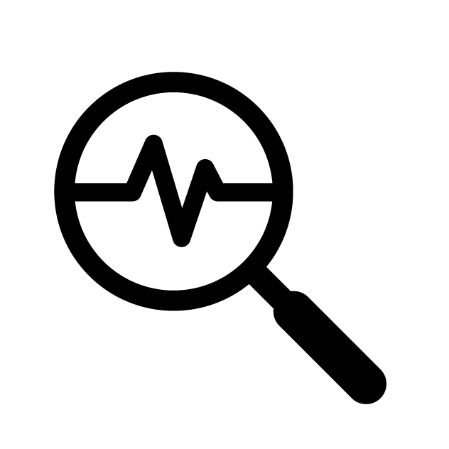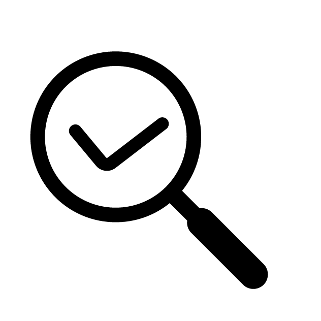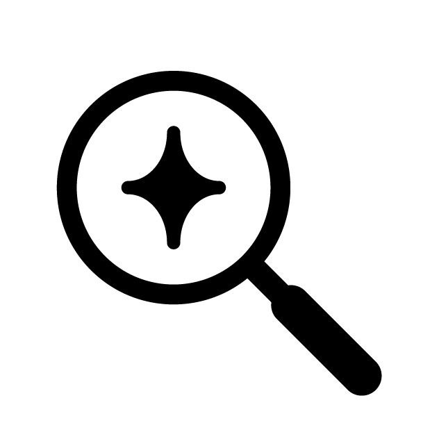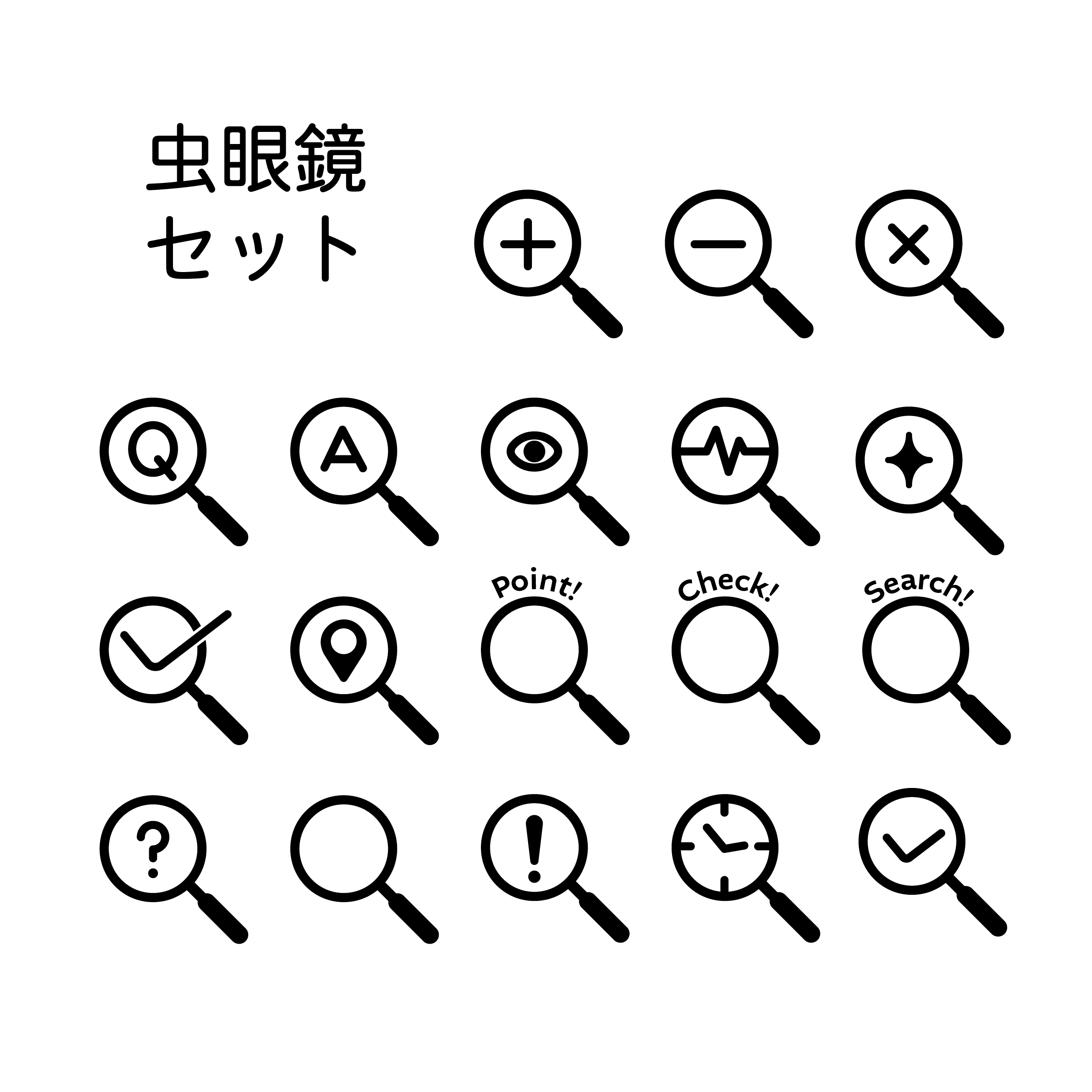 アイコンのイラスト虫眼鏡(ルーペ/拡大鏡/Search icon)をモチーフに、チェック、プラス(+)、マイナス(−)、バツ(×)、クエスチョン(?)、ビックリ(!)、視力や心電図、地点マークなど、検索に関連するシンボルを組み合わせた黒色のシンプルアイコンセットです。WebサイトやアプリUIのボタン、検索案内、チェック項目、ナビゲーション用途に使いやすいデザインで、モノクロで視認性の高いピクト素材として活躍します。