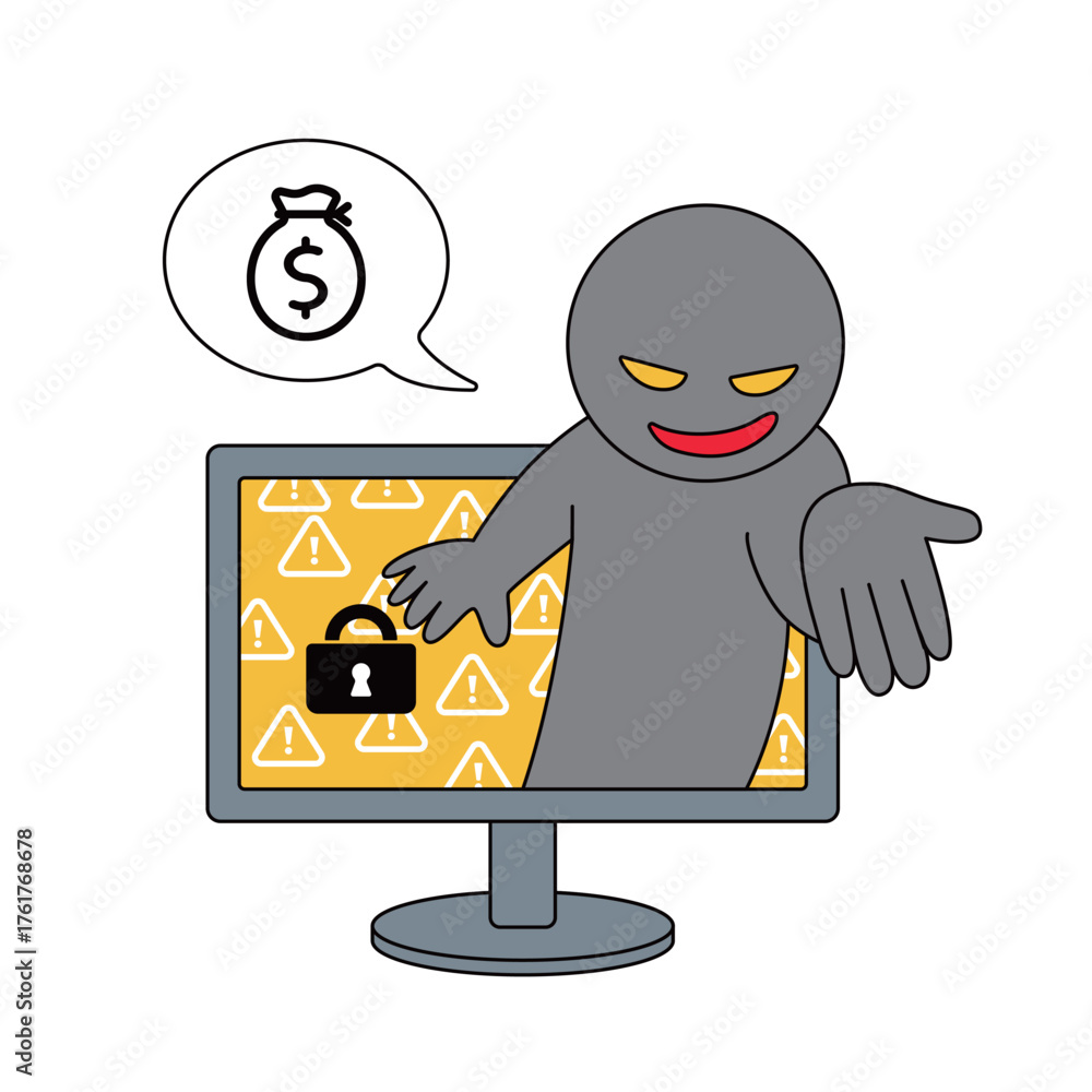 ITのイラストランサムウェア(身代金要求型ウイルス)の無料イラスト素材です。商用利用可能で、マルウェアやウイルス感染、サイバー攻撃、パソコンウイルス、ITセキュリティ、システム障害などのイメージカットや資料にご活用いただけます。