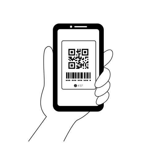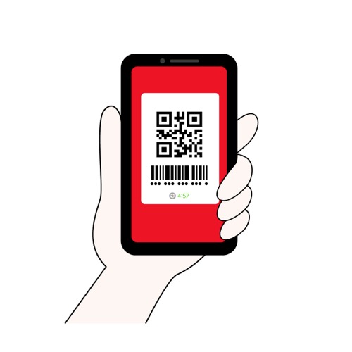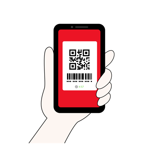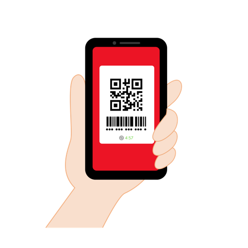 スマートフォンを片手で持ち、画面にQRコードとバーコードを表示させて決済を行う様子を描いたイラストです。キャッシュレス決済やモバイルペイメントの導入、電子マネーによる支払いの利便性を伝えるデザインに最適です。赤を基調とした画面構成で視認性が高く、Webサイトの解説記事、アプリの操作マニュアル、店頭のPOP、チラシなどの販促物など、幅広いビジネスシーンでご利用いただけます。