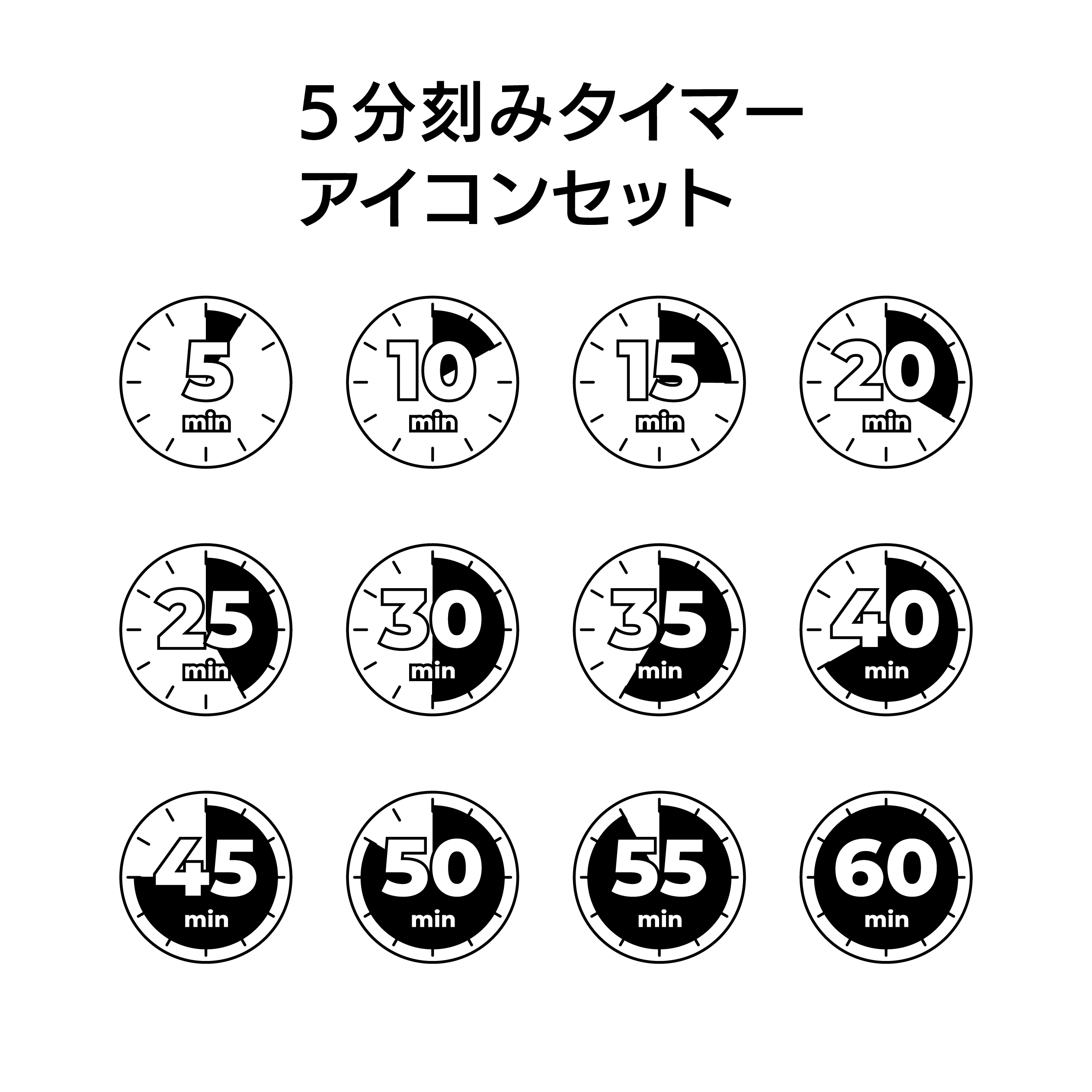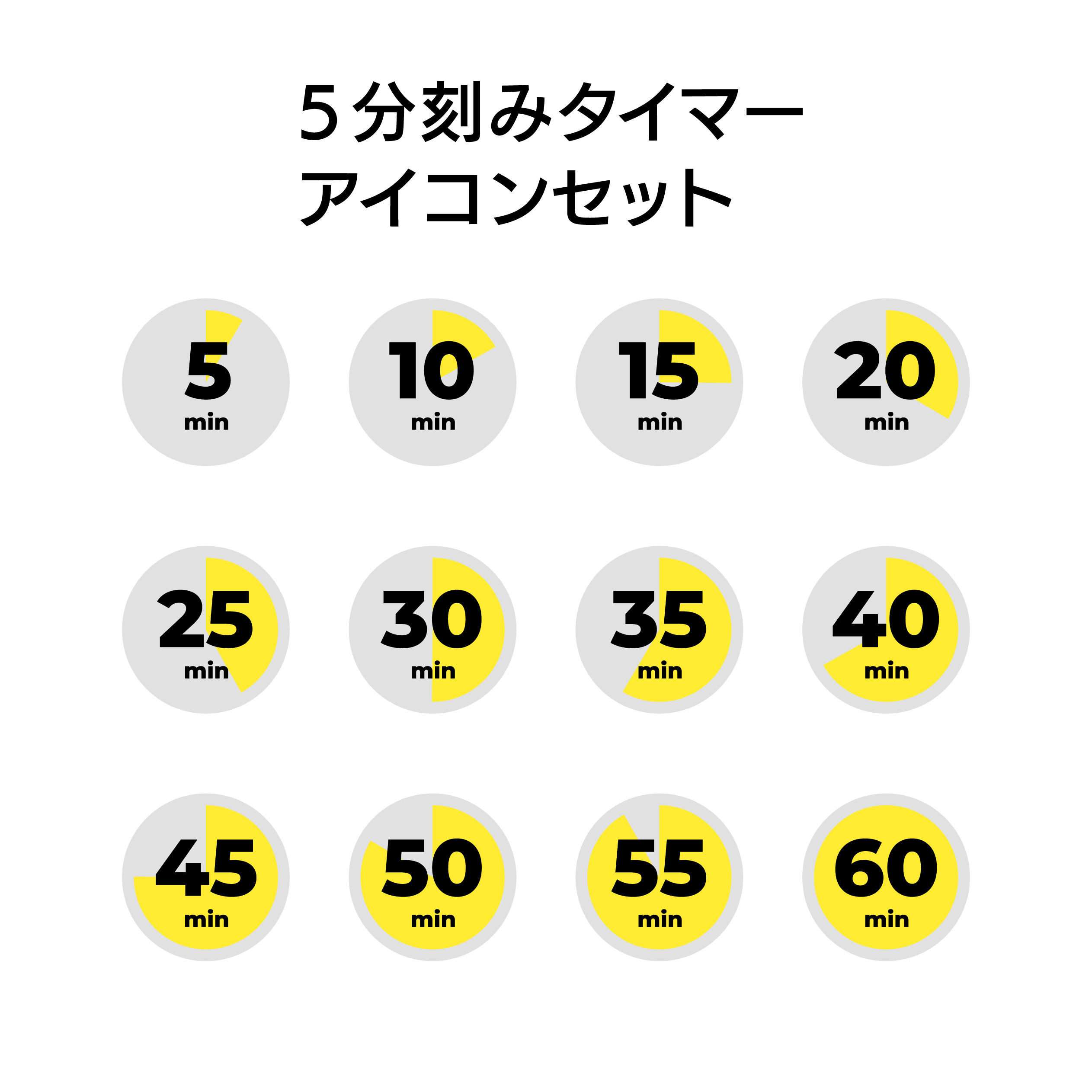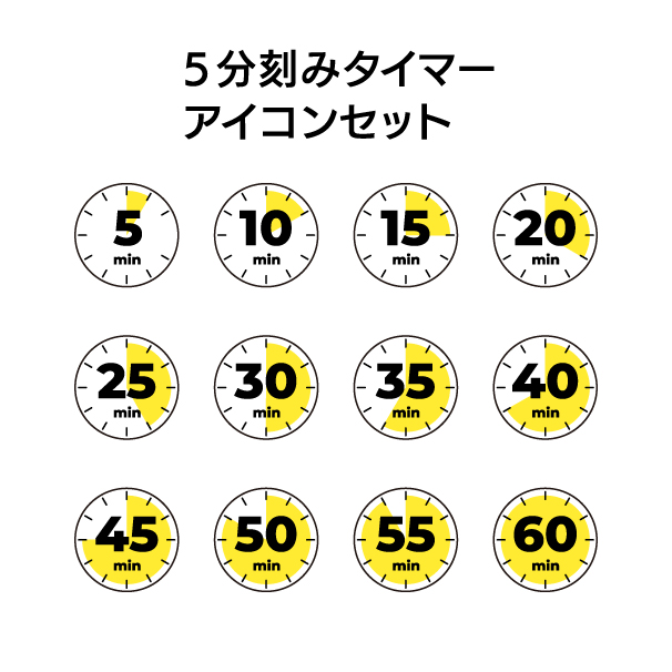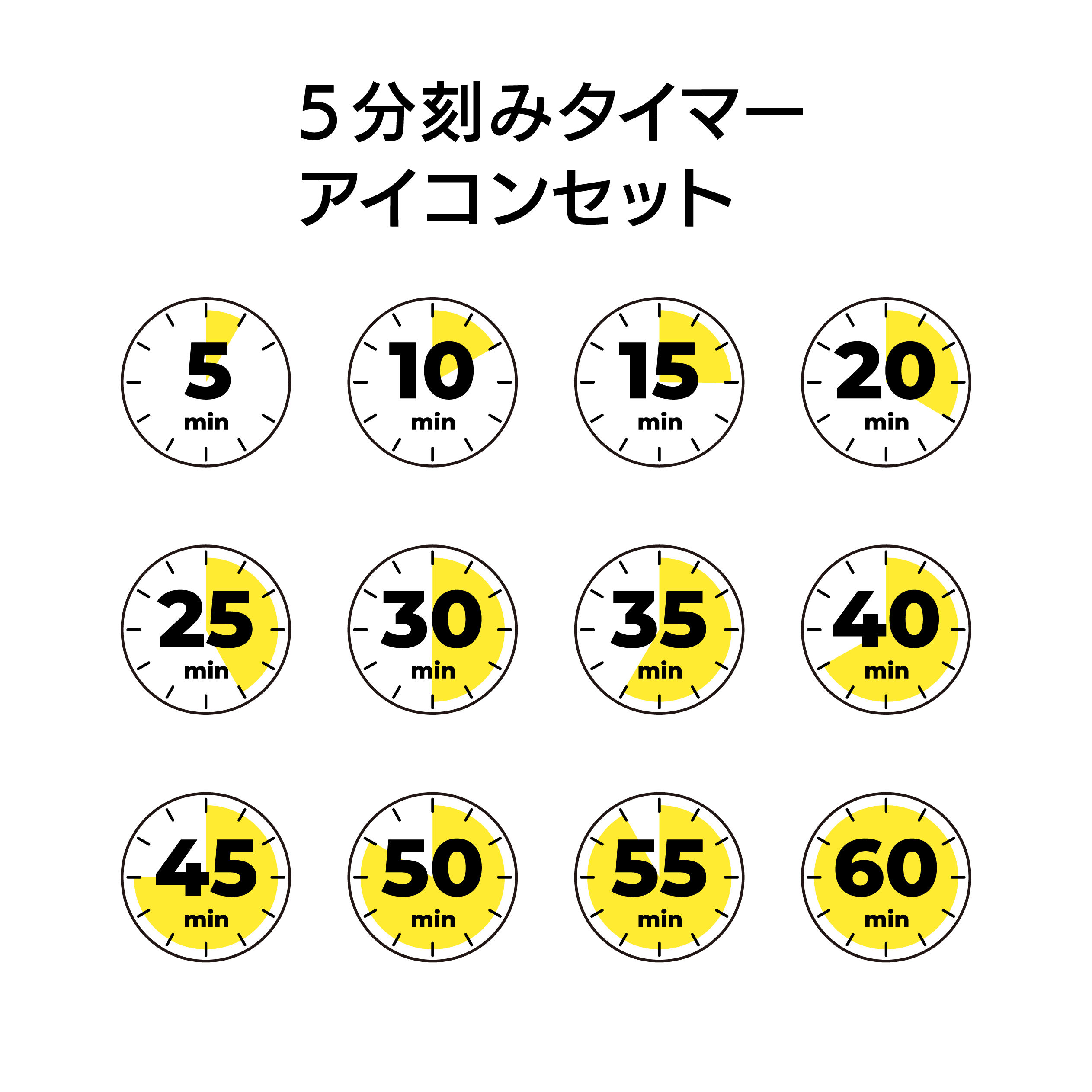 タイマーアイコン(たいまーあいこん/Timer Icon)は、時間管理やカウントダウン、スケジュール調整に使いやすいデザイン素材です。5分刻みのタイマーをモチーフにした黄色(イエロー/きいろ)のアイコンセットで、予定表やタスク管理、時間割などのビジュアル表現に最適。視認性が高く、ビジネス資料や教育用途、アプリUIにも活用できます。