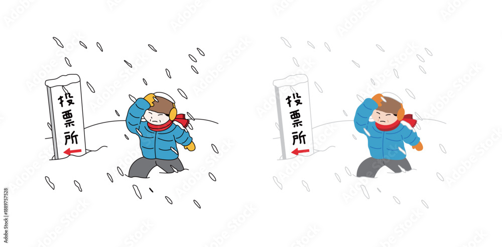 手描きイラスト・激しい吹雪と積雪の中を投票所に向かって歩く人物 | 選挙・悪天候での投票・冬の政治イベント・ニュース素材・社会 Stock ベクターをダウンロードし、Adobe Stock で類似のベクターを探しましょう。
